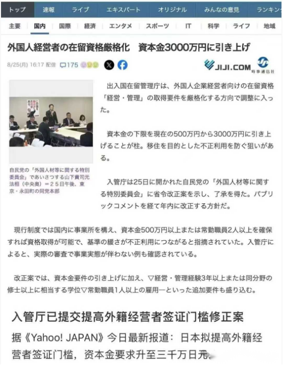 日本移民丨正式敲定:日本普通经营管理·签证,资本金涨到3000万日元,10月施行!