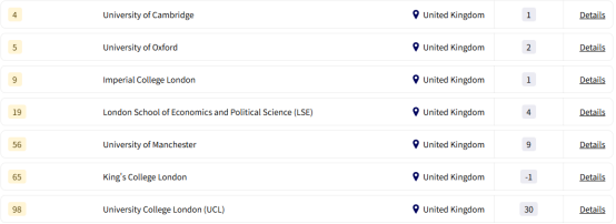 另外,G5 中的 IC、LSE 和 UCL 也都榜上有名,分别是第 9 名、第 19 名和第 98 名,体现 G5 院校在雇主眼中的高认可度。