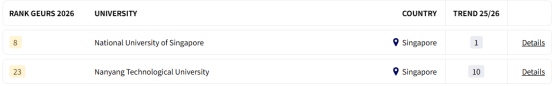 新加坡有 2 所大学进入前一百,其中,表现最好的是新加坡国立大学,排在第 8 名,是非常好的成绩了,另外一所大学是南洋理工大学,排在第 23 名。