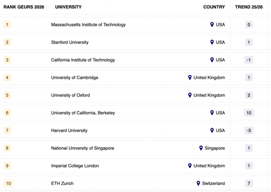加州大学伯克利分校与苏黎世联邦理工学院是今年新上榜 Top10 的院校。