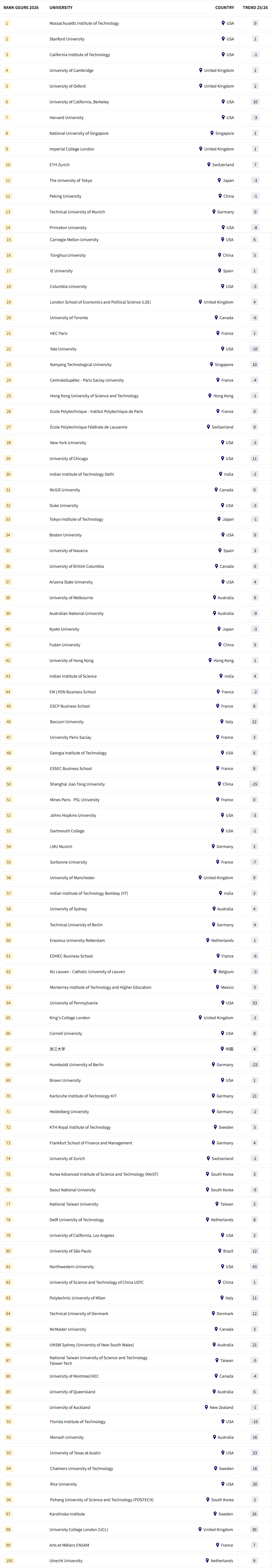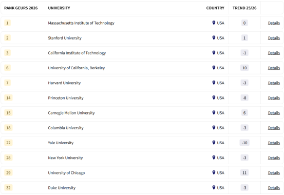 麻省理工学院蝉联第 1,斯坦福大学升至第 2,加州理工学院位列第 3,这三所院校牢牢占据全球就业力前三甲。