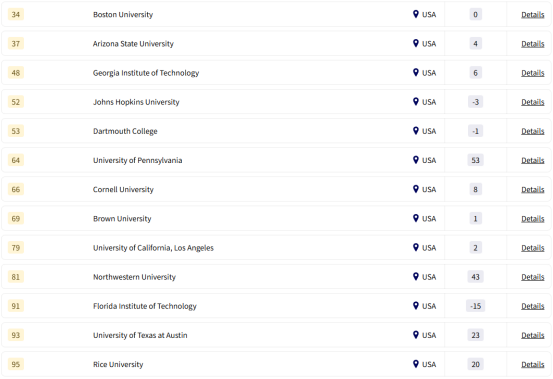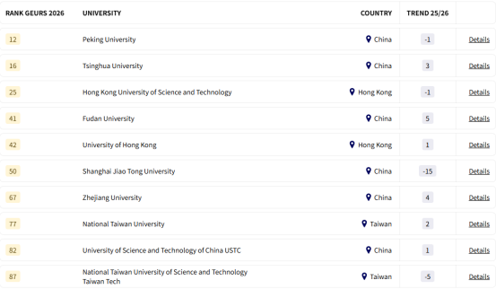 另外,中国香港地区的高校同样表现出色,香港科技大学、香港大学分别排在第 25 和 42 名。