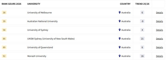 其中排名最优的是墨尔本大学,排在第 38 名,澳大利亚国立大学紧随其后,排在第 39 名。