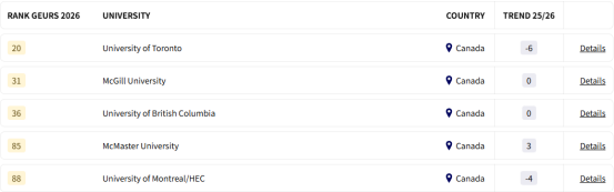 多伦多大学位列第 20 名,是加拿大就业力表现最突出的高校,麦吉尔大学、不列颠哥伦比亚大学分别排在第 31 名和 36 名,共同构成加拿大就业力的前三大学。