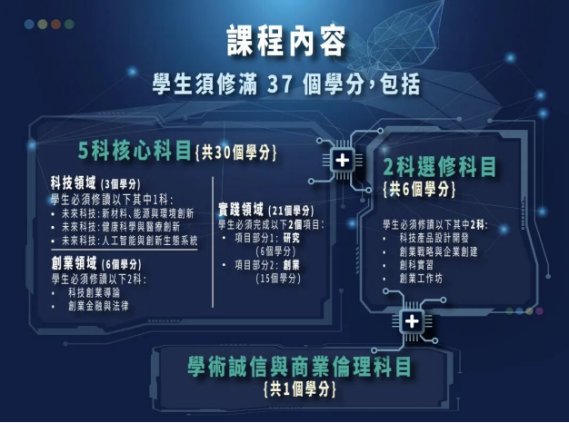 学生需修满37个学分,课程设计紧密围绕“科技”与“创业”两大核心。