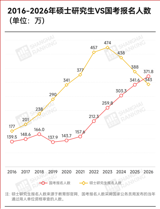 ⏩就业市场的导向变化更强化了这种理性。企业招聘从“学历筛选”转向“能力匹配”,实践经验的权重显著提升;同时,2026年国考371.8万的报名人数首次超过考研,编制岗位“本科可报、稳定性高”的特点,分流了大量考研意向者。