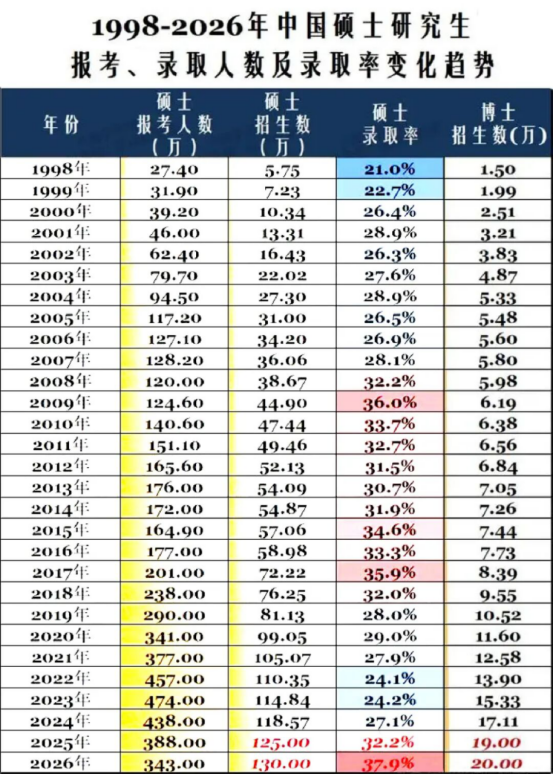 教育部刚公布的2026考研数据炸了:报名人数仅343万!对比2023年的474万顶峰,三年足足跌了131万。