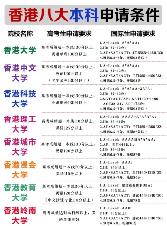 香港大学:文科超一本线130分以上,理科超过150分,英语130分,雅思6.5(单项6.0)。